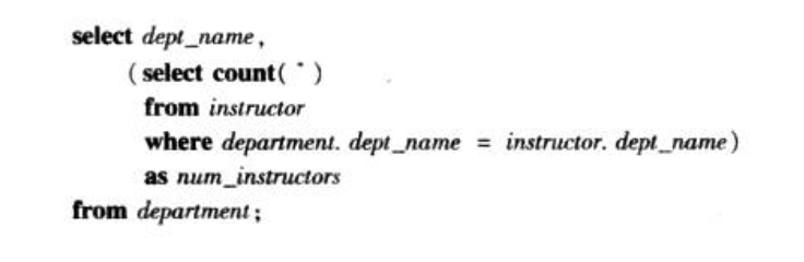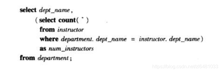 列出所有的系以及他们拥有的教师数,上面的子查询保证返回单个值,因为它使用了不带group by的count(*)聚集函数。标量子查询可以出现在select、where和having子句中,也可以不使用聚集函数来定义标量子查询,在编译时,并非总能判断一个子查询返回的结果中是否有多个元组,如果子查询被执行后结果中不只有一个元组,则产生一个运行时错误。