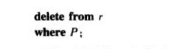 其中P代表一个谓词,r表示一个关系。delete语句首先从r中找出所有使P(t)为真的元组t,然后把它们从r中删除。如果省略where,则r中所有元组将被删除。