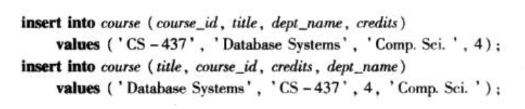 要往关系中插入数据,我们可以指定带插入的元组,或者写一条查询语句来生成待插入的元组集合,显然待插入的元组的属性值必须在相同属性的域中,待插入的分量数也必须是正确的。