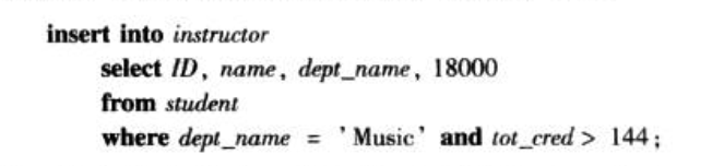 没有指定元组,而是用select选出一个元组,在执行插入。在插入之前先执行完select语句是非常重要的。如果在执行select语句同时执行插入动作,并且在关系上没有主码约束,这样会插入无数元组。