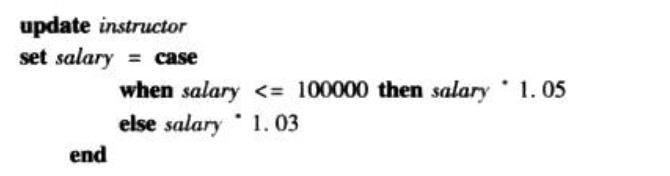 上述是将工资小于70000的教师涨工资。update语句中嵌套select可以引用待更新的关系。SQL提供case结构,可以利用它在一条update语句中执行前面两种更新,避免更新次序引发的问题: