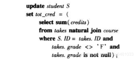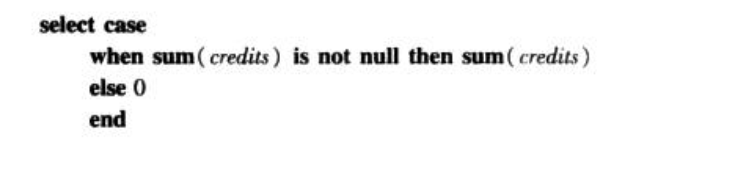 上述语句的意思是,将student元组的tot_cred属性设置为,该学生成功学完的课程的学分总和,假设一个学生的成绩既不是F,也不是空,那么他成功学完这门课程。上面的语句如果一个学生没有学完课程,则tot_cred会设置为空,如果想要将其设置为0,那么可以使用将select sum子句替换成使用case表达式。