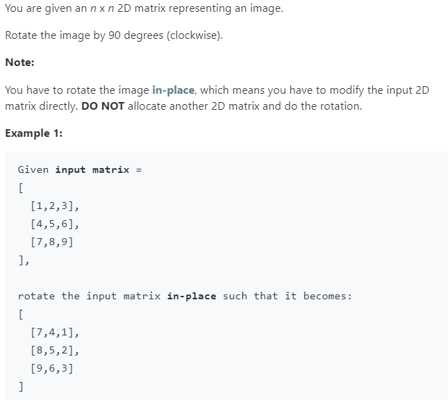 给定一个 n × n 的二维矩阵表示一个图像。将图像顺时针旋转 90 度。说明:你必须在原地旋转图像,这意味着你需要直接修改输入的二维矩阵。请不要使用另一个矩阵来旋转图像。