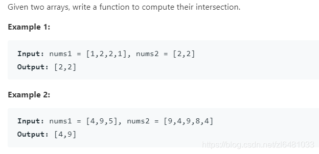 第二种方法和以前遇到的题很像,采用双指针,先将两个数组排序,然后定义两个指针分别指向两个数组的第一个元素,然后比较两个数是否相等,如果相等将其插入到结果中然后将两个指针向后移动,如果数组1的值大那就将数组2的指针向后移动,反之将数组1的指针向后移动。
