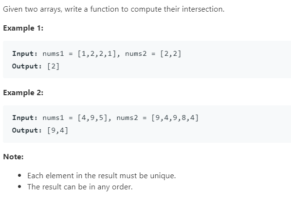 给定两个数组,编写一个函数来计算它们的交集。可以从例子上看出,这道题只需要找到两个数组中相同的数字就好,所以现将第一个数组放入一个set,set里没有重复的元素,并且是排好序的。之后遍历第二个数组看第二个数组中的元素是不是在set中,如果元素存在,则放入另一个set里,最后将set的元素输出到数组中。