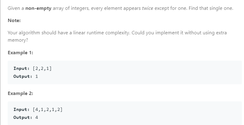 看到这个题首先想到的方法肯定是排序,然后遍历比较,但是这样时间复杂度很题目要求不一样,也不能使用map,题目要求不使用额外的空间。这里这个方法很巧妙,需要记下来以后备用。将数组的每一个元素进行异或计算,最后剩下的数字就是那个单独的数字。因为其他一样的数字在进行异或计算之后就变为0。