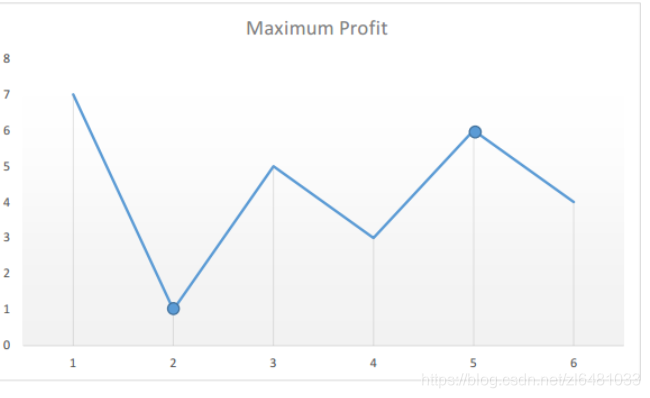 这道题官方给的第三种方法是一种很简单并且容易理解的方法,将数组的值绘制在图中,我们会发现这道题我们需要找到最小的谷之后最大的峰。之间的差也就是最大的利润。也就是卖出价格和最低价格之间最大的差值。时间复杂度是O(n)。空间复杂度是O(1)。