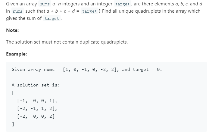 这道题和前面的三数之和很像很像,在前面我们将三数之和的问题转化成两数之和,那么这道题可以用相同的方法转换成两数之和。只不过这里的循环变成两重循环。第一重循环将四数问题转换成三数,第二重循环将三数问题转换成两数之和的问题。其他的和之前是一样的。