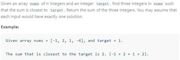 给定一个包括 n 个整数的数组 nums 和 一个目标值 target。找出 nums 中的三个整数,使得它们的和与 target 最接近。返回这三个数的和。假定每组输入只存在唯一答案。上图中有示例。