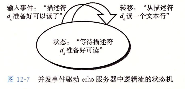 对于每个新的客户端k,基于IO多路复用的并发服务器会创建一个新的状态机Sk,并将它和已连接描述符dk联系起来,如下图每个状态机都有一个状态(等待描述符dk准备好可读)、一个输入事件(描述符dk准备好可以读了)和一个转移(从描述符dk读一个文本行)。