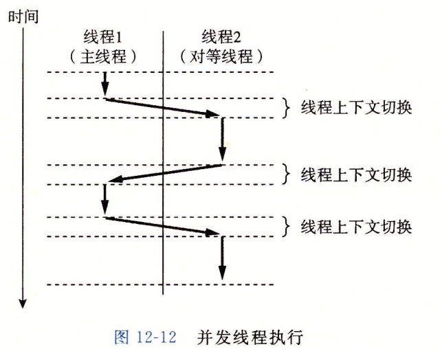 每个进程开始生命周期时都是单一线程,这个线程被称为主线程,在某一时刻,主线程创建一个对等线程,从这个时间点开始,两个线程就并发的运行,最后主线程执行一个慢速系统调用,例如read或者sleep,或者因为被系统的间隔计时器中断,控制就会通过上下文切换传递到对等线程,对等线程会执行一段时间,然后控制传回主线程,依次类推。