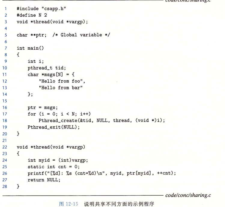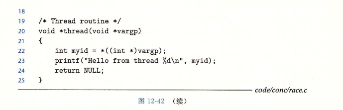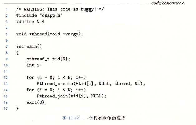 问题是由每个对等线程和主线程之间的竞争引起的。当主线程在13行创建一个对等线程,它传递了一个指向本地栈变量i的指针,在此时,竞争出现在下一次在12行对i加1之前执行了第22行,那么myid变量就得到正确的ID,否则它包含的就会是其他线程的ID。这个错误有可能不会出现,结果也有可能会是正确的,很难察觉到程序的错误。