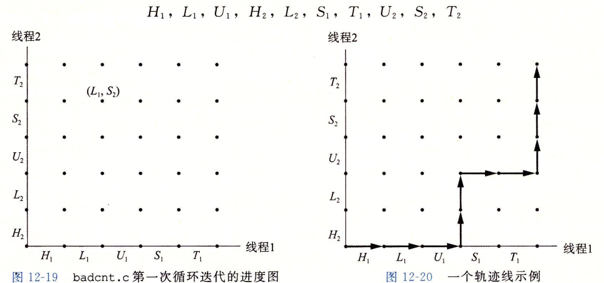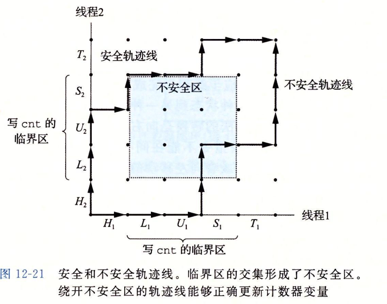 当一个程序的正确性依赖于一个线程要在另一个线程到达y点之前到达它的控制流中的x点时,就会发生竞争。通常发生竞争是因为程序员假定线程将按照某种特殊的轨迹线穿过执行状态空间,而忘记另一条准则规定:多线程的程序必须对任何可行的轨迹线都正确工作。