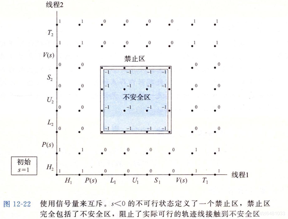 以这种方式来保护共享变量的信号量叫作二元信号量,因为它的值总是为0或1,以提供互斥为目的的二元信号量也常常称为互斥锁。在一个互斥锁上执行P操作称为对互斥锁加锁,类似的执行V操作称为对互斥锁解锁。对一个互斥锁加了锁但没有解锁的线程称为占用了这个互斥锁。一个被用作一组可用资源的计数器的信号量被称为计数信号量。下图的进度图展示了我们利用二元信号量来正确的同步计数器程序示例,每个状态都标出了该状态中信号量s的值。关键思想是这种P和V操作的结合创建了一组状态叫作禁止区。其中,s<0。因为信号的不变性,没有实际可行的轨迹线能够包含禁止区中的状态。而且因为禁止区完全包含了不安全区,所以没有实际可行的估计先能够接触不安全区的任何部分,因此每条可行的轨迹线都是安全的。而且不管运行时指令顺序是怎么样的,程序都会正确的增加计数器值。