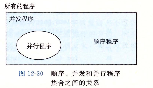 下图是顺序、并发和并行程序之间的几何关系,所有程序的集合能够被划分成不相交的顺序集合和并发程序的集合。并行程序是一个运行在多个处理器上的并发程序。