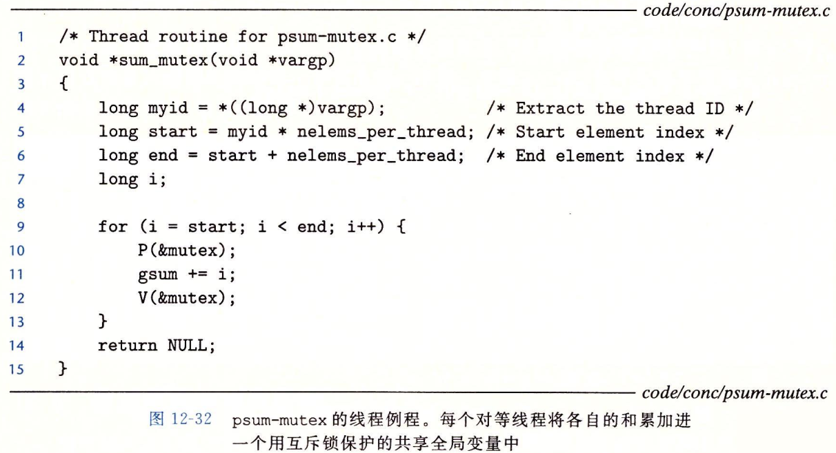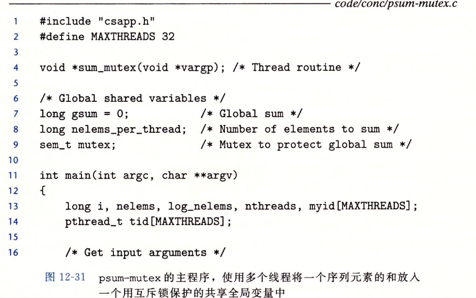 最简单也是最直接的选择是将线程的和放入一个共享的全局变量,用互斥锁保护这个变量。下图中实现了这个方法。在第28~33行,主线程创建对等线程,然后等待他们结束。注意主线程传递给每个对等线程一个小整数,座位唯一的线程ID,每个对等线程会用它的线程ID来决定它应该计算序列的哪一部分,这个向对等线程传递一个小的唯一的线程ID的思想是一项通用技术,许多并行应用中都用到了它。在对等线程终止后,全局变量gsum包含着最终和,然后主线程用闭合形式解答来验证结果。