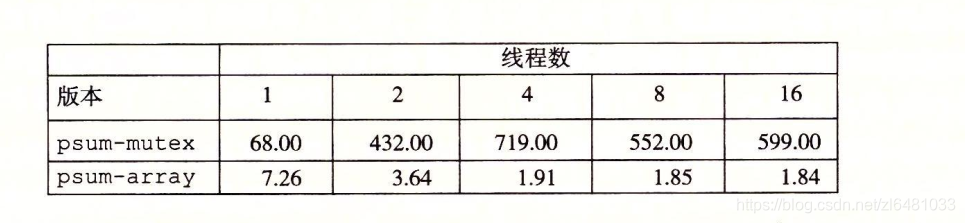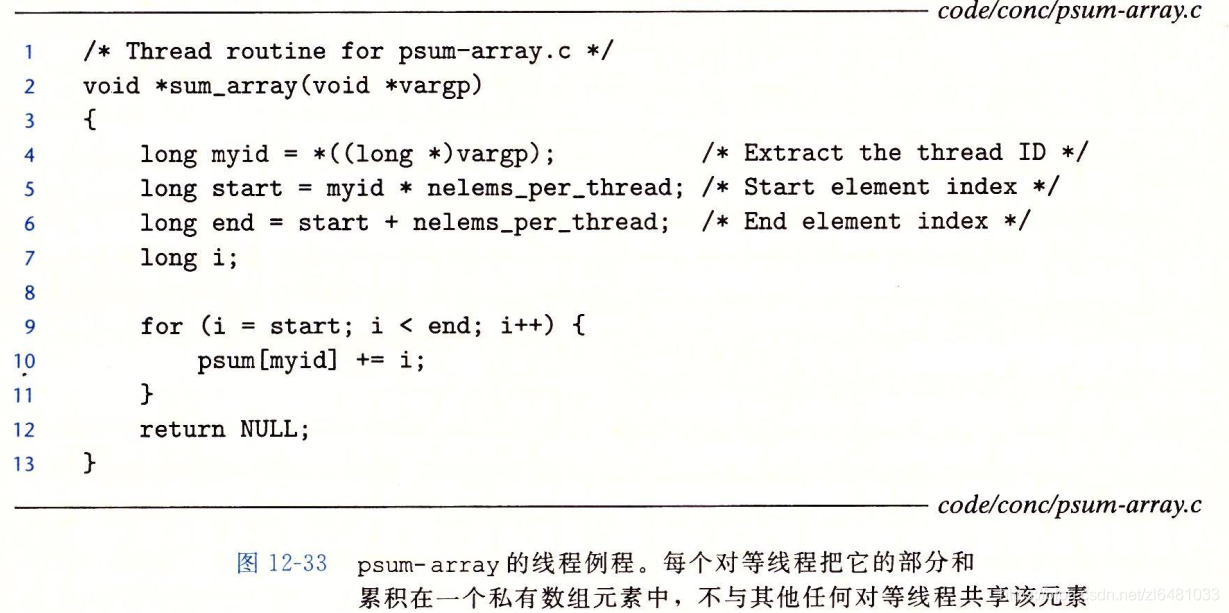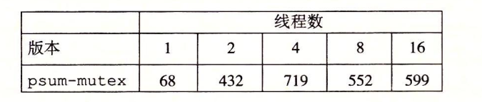在我们的例子中,一种避免同步的方法就是让每一个对等线程在一个私有变量中计算它自己的部分和,这个私有变量不与其他任何线程共享,如下图所示。主线程定义一个全局数组psum,每个对等线程i把他的部分和累积在psum[i]中,因为小心的给了每个对等线程一个不同的内存位置来更新,所以不需要用互斥锁来保护这些更新,唯一需要同步的地方是主线程不必须等待所有子线程完成,主线程把psum向量的元素加起来,得到最终结果。