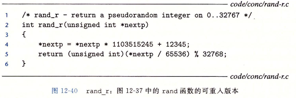 可重入函数通常比不可重入的线程安全函数高效一些,因为它们不需要同步操作。将第二类线程不安全函数转化为线程安全函数的唯一方法就是重写,使其变成可重入。下图是rand函数的一个可重入版本。关键思想是我们用一个调用者传递进来的指针取代了静态的next变量。