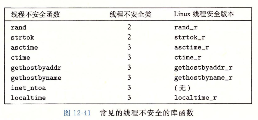 大部分linux函数,包括定义在标准C库中的函数都是线程安全的,只有一小部分例外。见下图。其中strok函数已经弃用。asctime、ctime和localtime函数是在不同时间和数据格式之间转换经常使用的函数。gethostbyname、gethostbyaddr和inet_ntoa函数已经弃用。被可重入的getaddrinfo、getnameinfo和inet_ntop函数取代。除了rand和strtok以外,所有线程不安全函数都是第三类,他们返回一个指向静态变量的指针。如果我们要在一个线程化的程序中调用这些函数最容易的就是加锁-复制。然而加锁-复制也有很多缺点。首先,额外的同步降低了程序的速度,第二,像gethostbyname这样的函数返回指向复杂结构的结构的指针,要复制整个结构层次需要深层复制。第三,加锁-复制方法对rand这样依赖跨越调用的静态状态的第2类函数并不有效。linux提供大多数线程不安全的函数的线程安全版本,可重入版本的名字总是以“_r”后缀结尾。