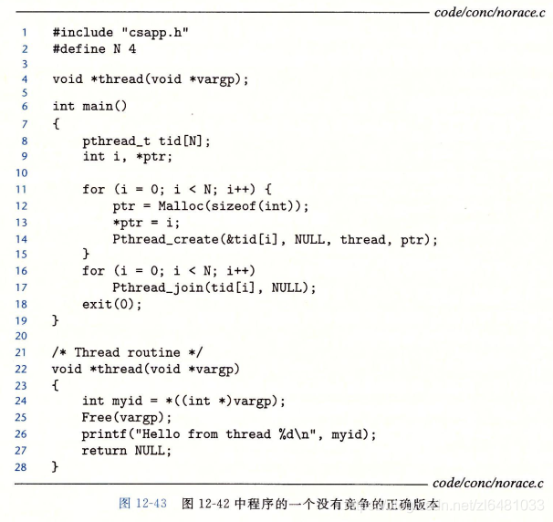 为了消除竞争,可以动态的为每个整数ID分配一个独立的块,并且传递给线程例程一个指向这个块的指针。如下图所示,注意线程必须释放这些块以避免内存泄漏。这样就会得到正确的结果。