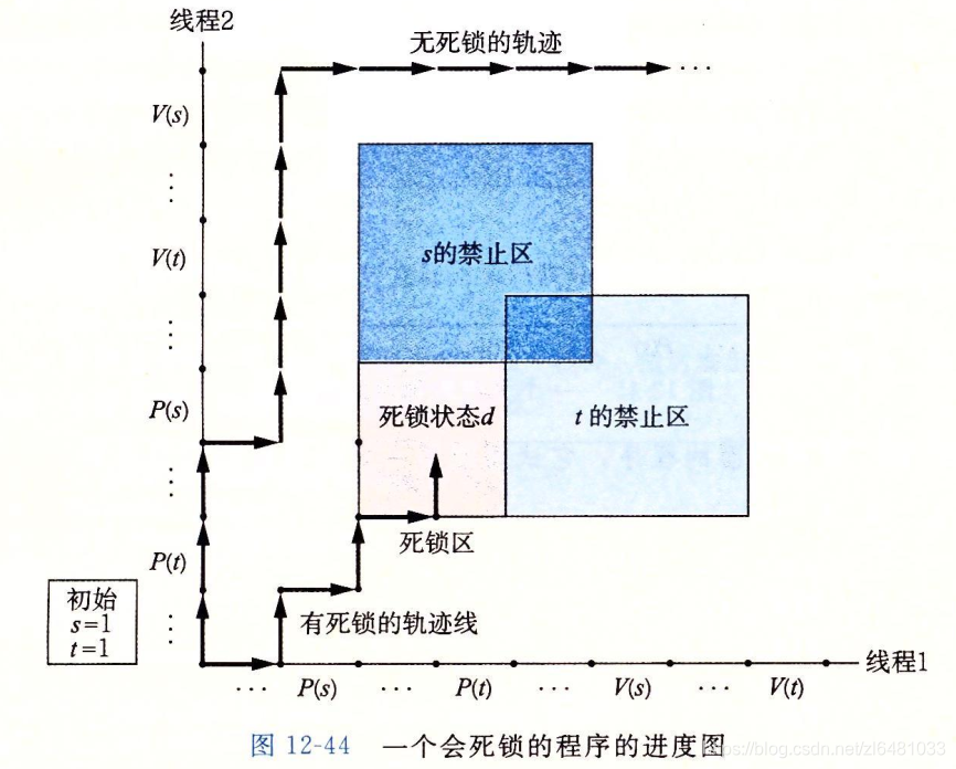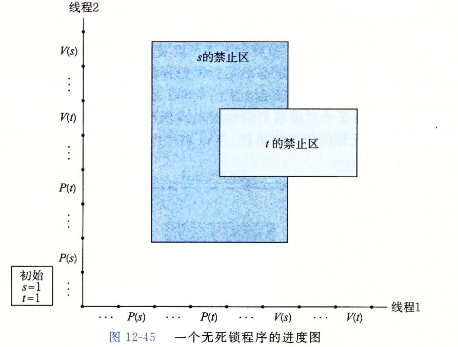 *程序员使用P和V操作顺序不当,以至于两个信号量的禁止区域重叠,如果某个执行轨迹线碰巧到达了死锁状态d,那么就不可能有进一步的进展了,因为重叠的禁止区域阻塞了每个合法向上的进展,换句话说,程序死锁是因为每个线程都在等待其他线程执行一个根本不可能发生的V操作。