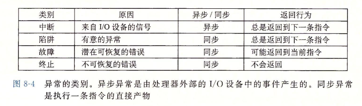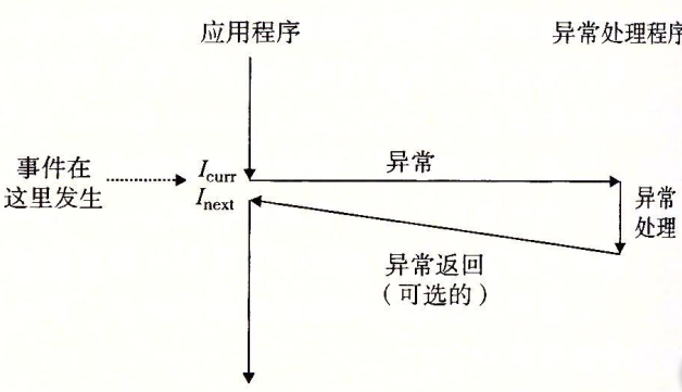 上图中,当处理器状态中发生一个重要的变化时,处理器正在执行当前指令Icurr,在处理器中状态被编码成为不同的位和信号,状态变化称为事件,事件可能与当前执行的指令直接相关,比如发生虚拟内存缺页,算术溢出,定时器信号,IO请求等。