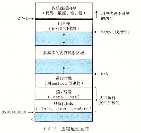 地址空间底部是保留给用户程序的,包括通常的代码、数据、栈和栈段。代码段总是从地址0x400000开始,地址空间顶部保留给内核(操作系统常驻内存部分)地址空间这个部分包含内核在代表进程执行指令时使用的代码、数据和栈。