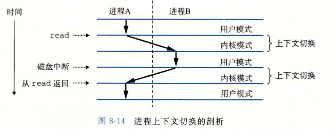 磁盘读取数据要用一段相对较长的时间,所以内核执行从进程A到进程B的上下文切换,而不是在这个时间什么也不做,切换之前内核正代表A在用户模式下执行指令,切换的第一部分代表A在内核模式下执行指令,某一时刻又开始代表B(内核模式)执行指令,在切换之后内核代表进程B在用户模式下执行指令。随后B在用户模式下运行一会直到磁盘发出一个中断信号,表示数据已经从磁盘传送到内存,内核判定B已经运行足够长事件,执行一个从B到A的上下文切换,将控制返回给A紧随read之后的指令,A继续运行。