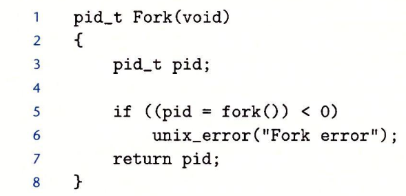 给定这个包装函数对fork的调用就缩减为1行,这一点在csapp.c中很常见。