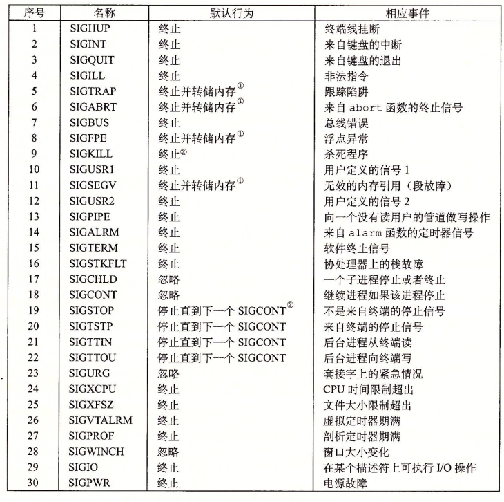 当内核把进程p从内核模式切换到用户模式时,它会检查进程p的未被阻塞的待处理信号的集合,如果这个集合为空,那么内核将控制传递到p的逻辑控制流中的下一条指令。如果集合是非空的,那么内核选择集合中的某个信号k(通常是最小的k),并且强制p接收信号k,收到这个信号会触发进程采取某种行为,一旦进程完成了这个行为,那么控制就传递回p的逻辑控制流中的下一条指令,每个信号类型都有一个预定的默认行为,是下面的一种: