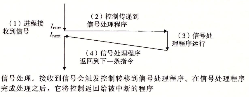 当一个进程捕获了一个类型为k的信号时,会调用为信号k设置的处理程序,一个整数参数被设置为k。这个参数允许同一个处理函数捕获不同类型的信号。当处理程序执行它的return语句,控制通常传递回控制流中进程被信号接收中断位置处的指令。