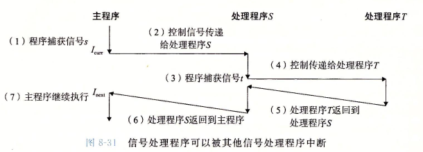 隐式阻塞机制。内核默认阻塞任何当前处理程序正在处理信号类型的待处理的信号。例如,上图,假设程序捕获了信号s,当前正在运行处理程序S,如果发送给该进程另一个信号s,那么直到处理程序S返回,s会变成待处理而没有被接收。