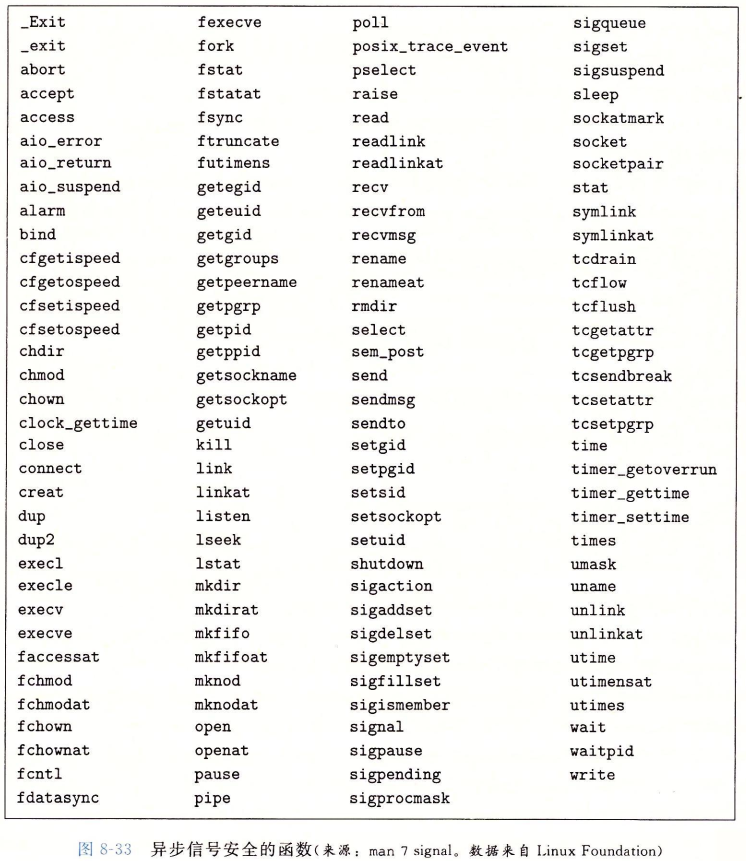 2)在处理程序中只调用异步信号安全的函数,所谓的异步信号安全的函数能够被信号处理程序安全调用,要么它是可重入的(只访问局部变量)要么是不能被信号处理程序中断,下图是linux保证安全的系统级函数。