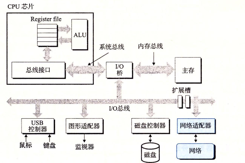 客户端和服务器通常运行在不同的主机上,并且通过计算机网络的硬件和软件资源来通信。对于主机而言网络只是一种IO设备,是数据源和数据接收方,一个插到IO总线扩展槽的适配器提供了到网络的物理接口,从网络上接受的数据从适配器经过IO和内存总线复制到内存,通常是通过DMA(数据不经过CPU)传送,同样,数据也能从内存复制到网络。