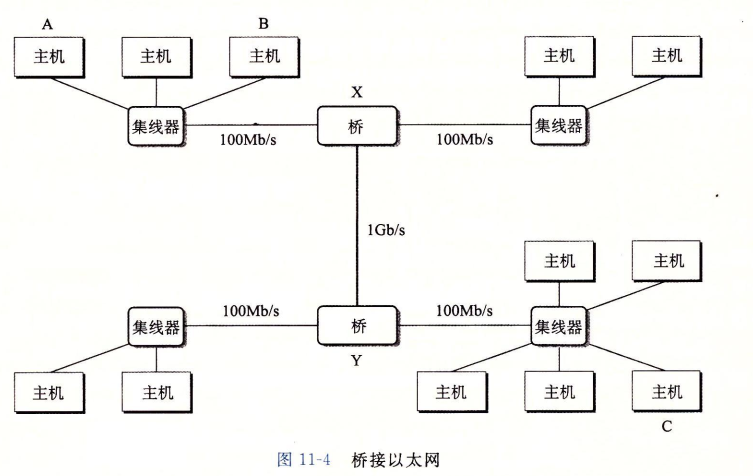 使用一些电缆和网桥,可以将多个以太网段连接成较大的局域网。称为桥接以太网。一些电缆连接网桥和网桥,一些连接集线器和网桥,它们的带宽可以不一样。