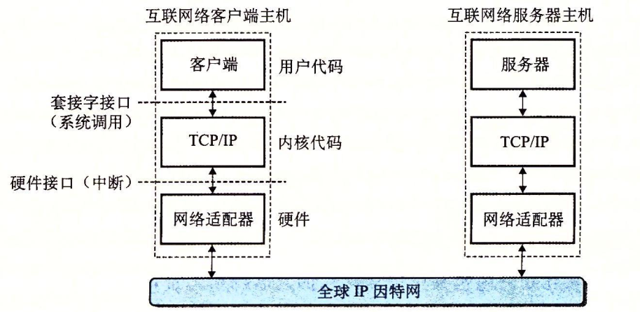 每台因特网主机都运行实现着TCP/IP协议的软件,几乎每个现代计算机系统都支持这个协议,因特网的客户端和服务器混合使用套接字接口函数和Unix IO函数进行通信,通常套接字函数实现为系统调用,这些系统调用会陷入内核,并调用各种内核模式的TCP/IP函数。