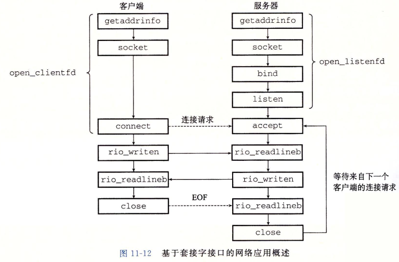 套接字接口是一组函数,它们和Unix IO函数结合起来,用来创建网络应用。大多数现代系统上都实现套接字接口,包括所有的Unix 变种、windows等,下图是一个典型的客户端-服务器事务的上下文中的套接字接口概述。
