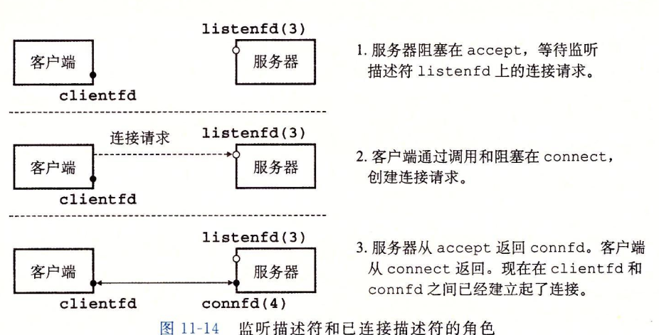 客户端-服务器通过使用套接字接口建立连接,一个套接字是连接的一个端点,连接以文件描述符的形式提供给应用程序,套接字接口提供了打开和关闭套接字描述符的函数,客户端和服务器通过读写这些描述符来实现彼此之间的通信。