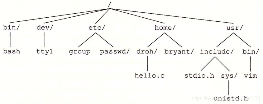 linux内核将所有文件都组成一个目录层次结构,由名为/的根目录确定。系统中每个目录都是根目录的直接或间接的后代。如下图: