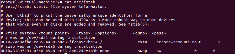 查阅文件/etc/fstab内容。