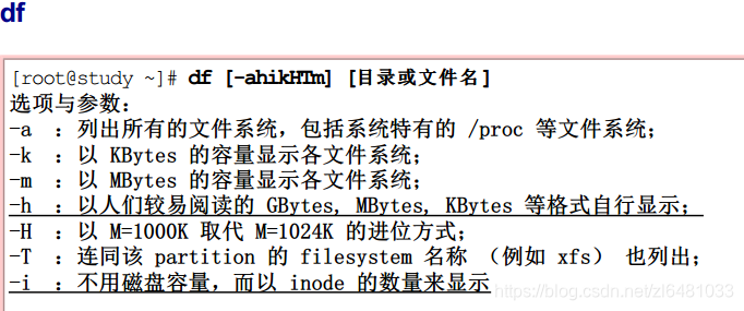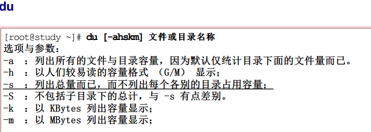 -h或-m改变容量,Used:用掉的磁盘,Avaiable:剩下的磁盘空间大小,Use%:磁盘使用率,Mounted on:磁盘挂载的目录所在。其余的使用方法可以参考选项参数。