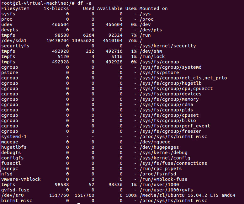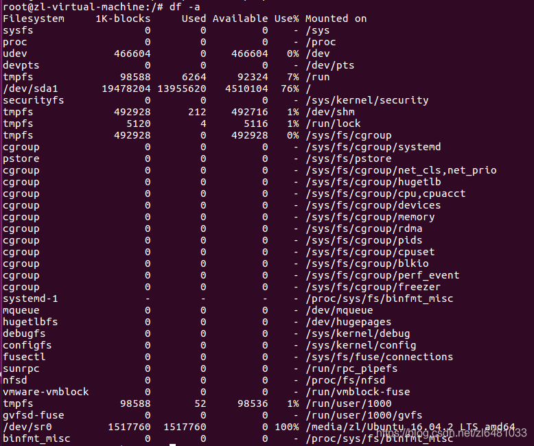以df主要读取的数据是针对整个文件系统,读取的是superblock内的信息,所以这个指令显示结果的速度很快,要注意的是更目录的剩余容量,所有的数据都是由根目录衍生出来的,如果根目录剩余容量为0那么很可能就存在问题了。/proc这个挂载点是挂载在内存中的,所以没有占用任何磁盘空间。/dev/shm/目录是利用内存虚拟出来的磁盘空间,通常是实体内存的一半。