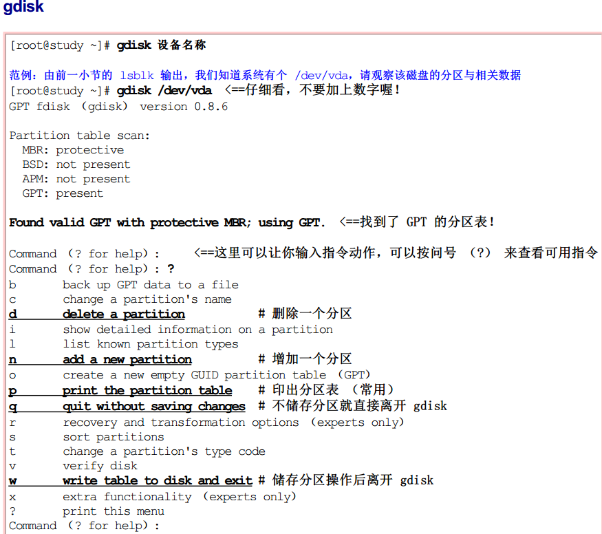 gdisk新增分区,删除分区。参考上图。fdisk使用方法和gdisk基本一样。
