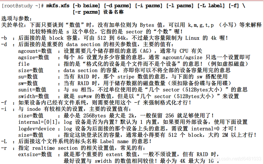 XFS文件系统 mkfs.xfs,指令具体参数选项如下: