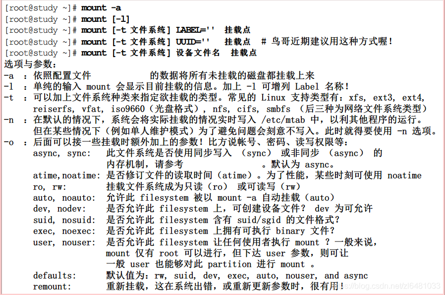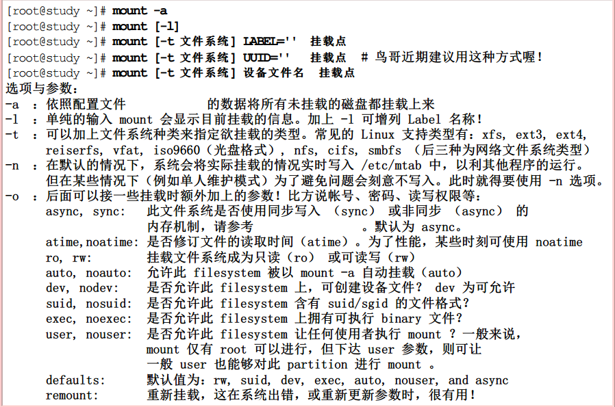 挂载点是目录,而目录是进入磁盘分区(其实就是文件系统)的入口。在挂载之前最好确认:(1)单一文件系统不应该被重复挂载在不同的挂载点。(2)单一目录不应该重复挂载多个文件系统。(3)要作为挂载点的目录,理论上都是空目录。