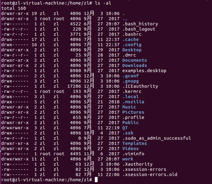 ls 命令,查看文件,ls就是list的意思,显示文件的文件名和相关属性。可以使用 su命令切换身份为root,ls -al表示列出所有文件详细的权限和属性。如下图