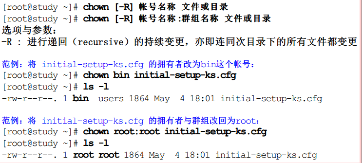 和chgrp一样的是,改变的拥有者必须是存在在系统中的账号,也就是在/etc/passwd/这个文件中。chown 还可以顺便修改群组的名称,如果要连目录下的所有次目录和文件同时更改文件拥有者的话,直接加上 -R即可。语法范例: