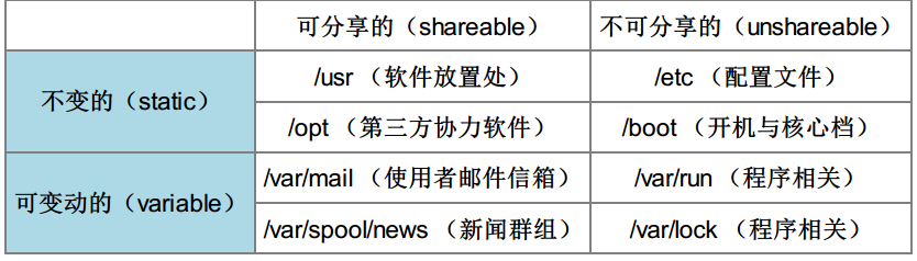 不变的:有些数据是不会经常变动的,例如函数库、文件说明文档、系统管理员所管理的主机服务配置文件等等。