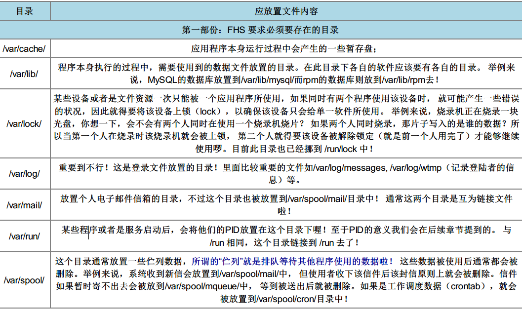 事实上,FHS针对目录树架构仅定义出三层目录下面应该放置什么数据,分别是:/(root根目录,与开机系统有关),/user(与软件安装与执行有关),/var(与系统运行过程有关)。