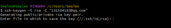 首先,根据网上教程使用Git命令git-keygen -t rsa -C "个人邮箱"得到如下界面: